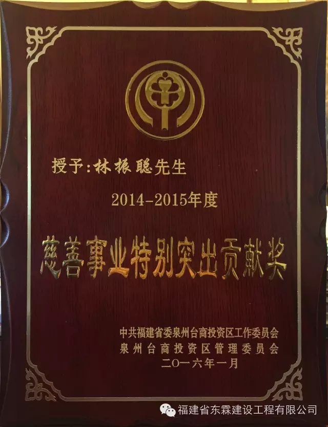 “德莫大于仁,莫大于善”,福建东霖建设工程集团的林董事长感恩社会,更不忘回馈:2012-2015年期间,林董事长为福建省泉州台商投资区慈善基金会先后认捐了人民币1500万元慈善资金,为台商投资区的慈善事业添砖加瓦。此举充分展现了以林董事长为首的东霖人善尽社会责任,肩负历史使命感,愿为社会和谐美好做出奉献的决心和勇气。近日,泉州台商投资区慈善总会召开了“泉州台商投资区慈善表彰大会”,同时颁发了“慈善事业特别突出贡献奖”。其中,福建东霖建设工程集团董事长林振聪获此殊荣。