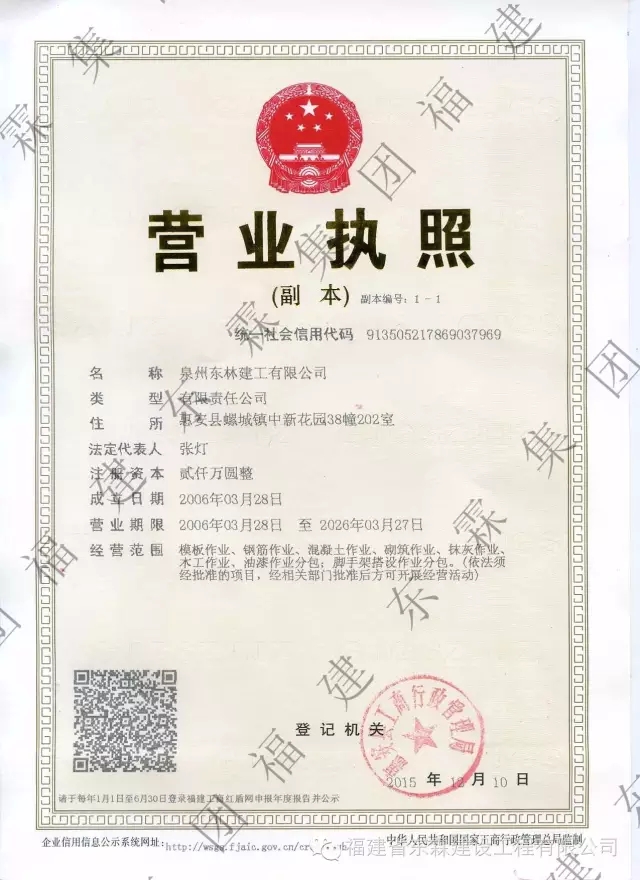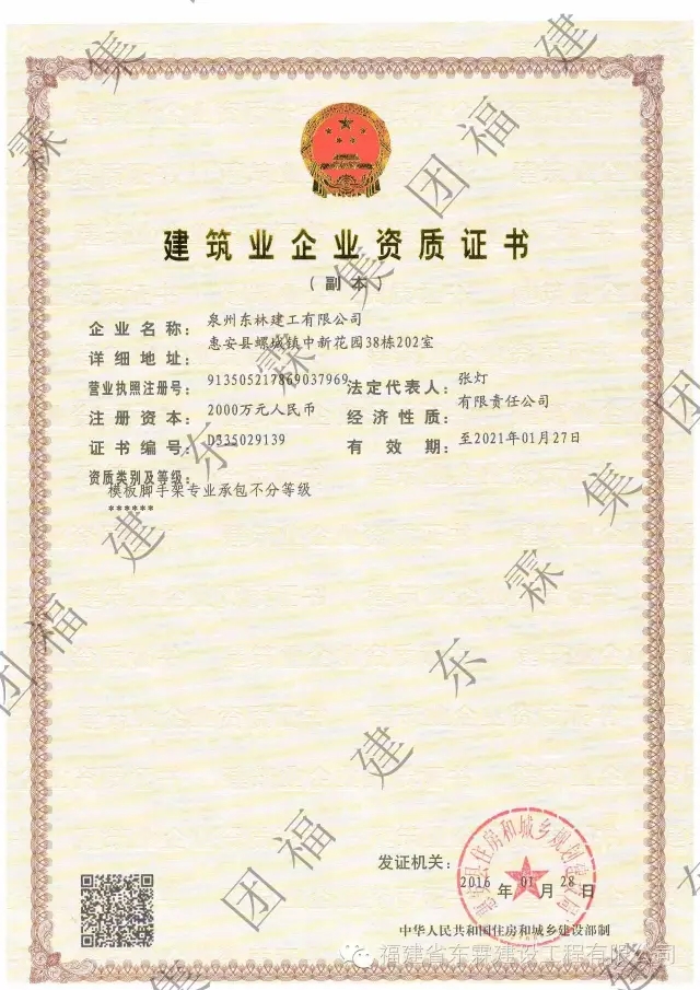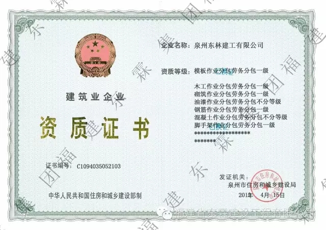 根据福建省住房和城乡建设厅《关于先行先试推进建筑模板、脚手架一体化工作的通知》(闽建筑〔2013〕19号)、《关于加快推进模板脚手架一体化企业试点工作的通知》(闽建筑〔2015〕27号),经企业申报、设区市建设行政主管部门核准,泉州东林建工有限公司的模板脚手架专业承包具备模板脚手架一体化条件。