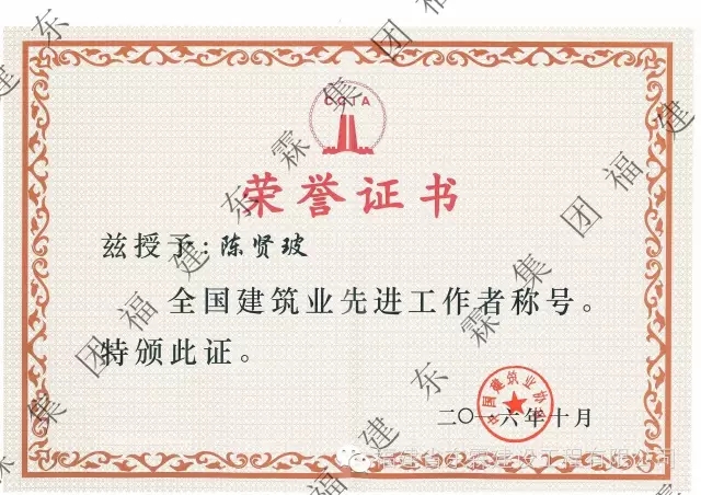 为鼓励“十二五”期间在建筑业改革和发展中做出突出贡献的企业和个人,在会议上授予北京城建集团有限责任公司等317家企业“全国建筑业先进企业”荣誉称号,授予吴继华等590名同志“全国建筑业先进工作者”荣誉称号,福建东霖建设工程集团总经理陈贤玻同志荣获全国建筑业先进工作者。