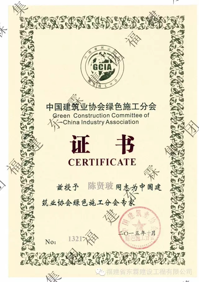陈贤玻同志自从事建筑业后并于2015年10月担任中国建筑业协会绿色施工分会专家以来,认真贯彻学习《绿色施工导则》、《建筑工程绿色施工评价标准》,主持编制项目绿色施工方案,对建筑全生命周期内〝四节一环保〞的有效措施有一定的见解。