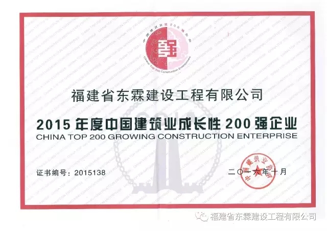福建省东霖建设工程有限公司荣获2015年度中国建筑业成长性200强企业,位列中国建筑业成长性企业第138位。
