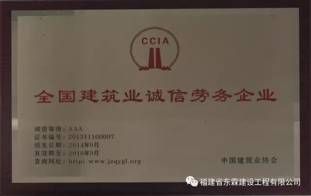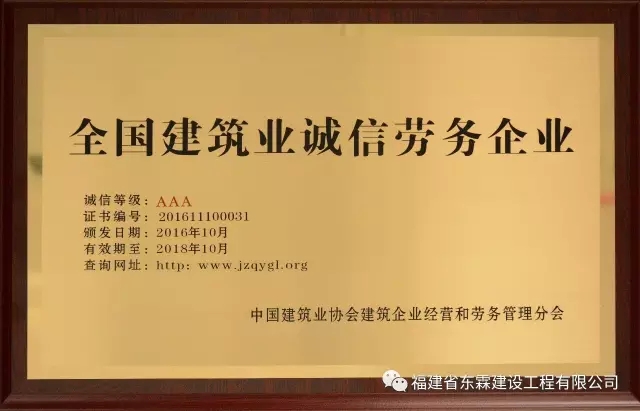 经专家组初审,全国建筑业诚信劳务企业评审委员会审定,确定孝感市双德建筑工程有限责任公司等190家企业为2015年度AAA级全国建筑业诚信劳务企业,福建东霖建设工程集团下属全资控股子公司泉州东林建工有限公司再获此殊荣。