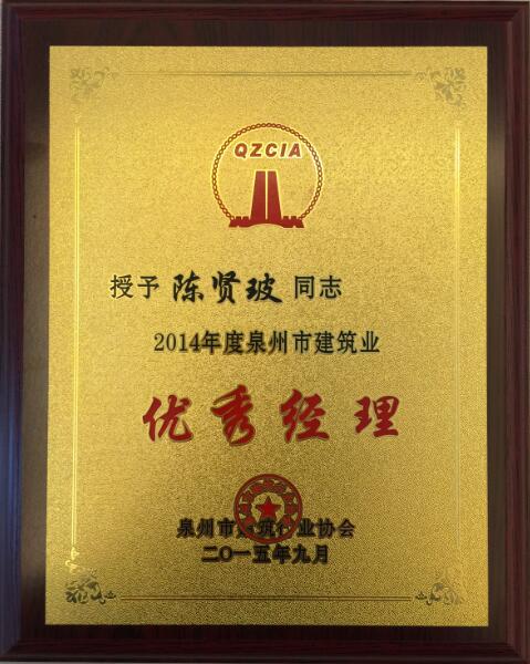 2015年9月22日被泉州住房和城乡建设局授予2014年度”泉州市建筑业先进企业“,同时我司总经理荣获2014年度”泉州市建筑企业优秀经理“称号。